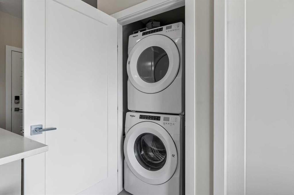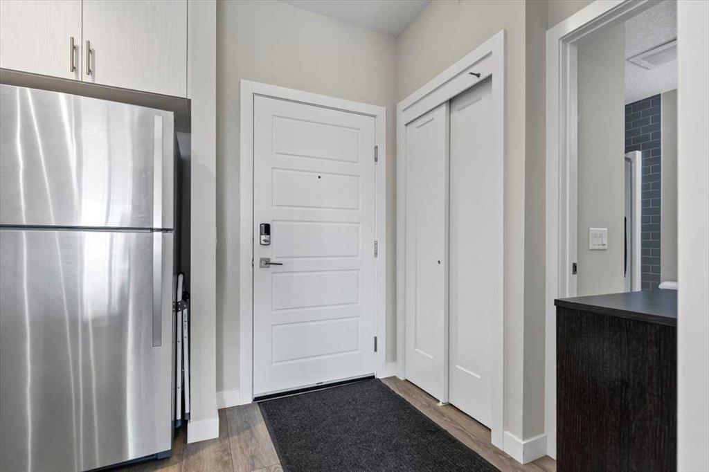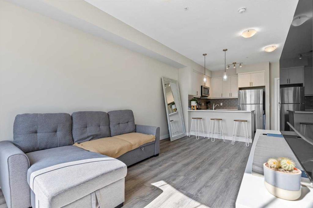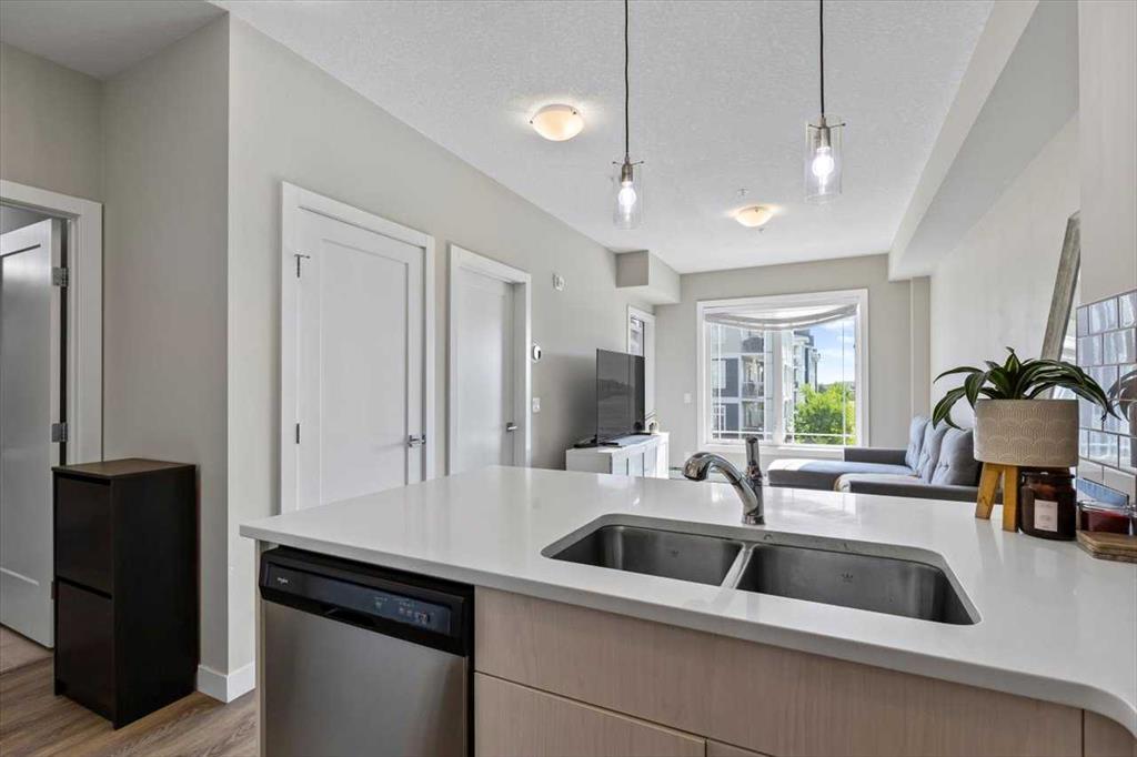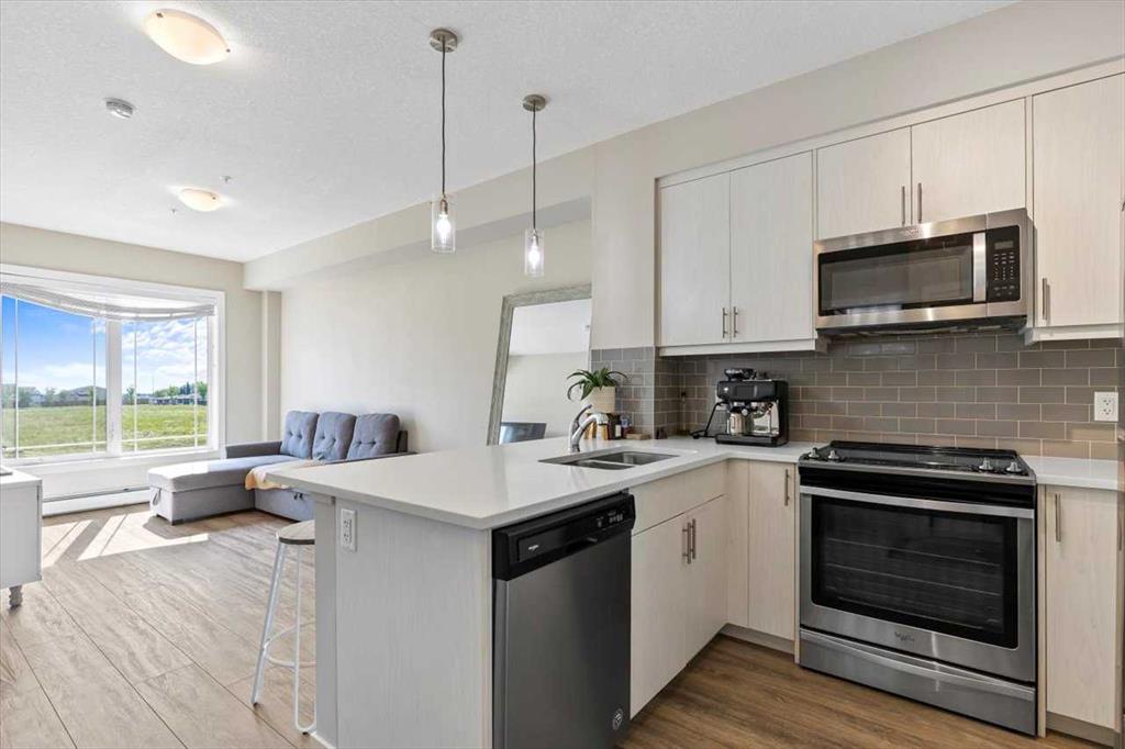 Lake Living in Auburn Bay! Step into this beautifully maintained one-bedroom condo on the 3rd floor — the perfect choice for first-time buyers or savvy investors. Bathed in natural light from its east-facing windows, the open-concept living and kitchen area creates a bright and inviting atmosphere. The kitchen is a true highlight, featuring ceiling-height soft-close white cabinetry, a sleek quartz island, stainless steel appliances, and a full tile backsplash. The spacious bedroom offers a walk-through closet leading directly to a stylish 4-piece ensuite with a walk-in shower and modern vanity. You’ll also enjoy the convenience of in-suite laundry with a stacked washer and dryer. Step outside to your large private patio with a BBQ gas hookup — perfect for morning coffee or summer evenings. Additional features include 9-foot ceilings and a separate storage locker for all your extras. Located in an unbeatable spot, you’re just steps from Co-Op grocery, the South Health Campus, Auburn Bay Lake, schools, parks, and the dog park. Don’t miss this opportunity to enjoy lake community living with every amenity at your doorstep!